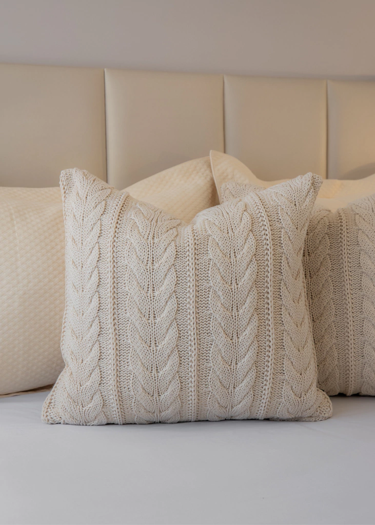 ALMOFADA EM TRICOT TRANÇA LARGA em tons offwhite super clean, Trança Larga de Alto Padrão pronta para levar muito aconchego para seu quarto.. Essa almofada tem tamanho quadrado com 48x48, feita com tecido bordado todo tricotado em trança larga offwhite.