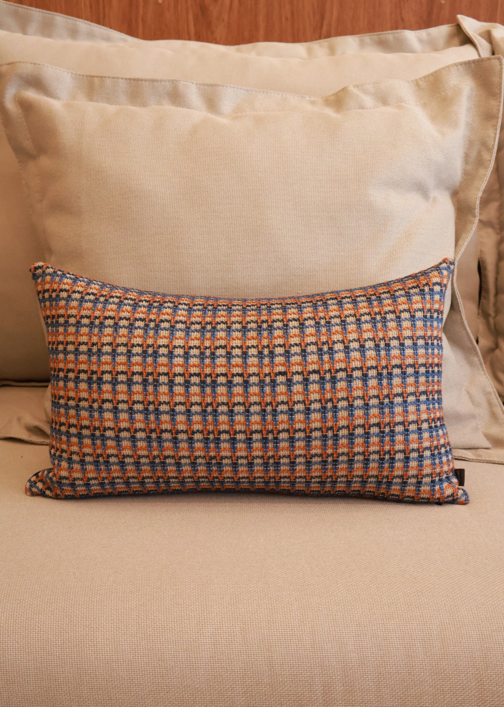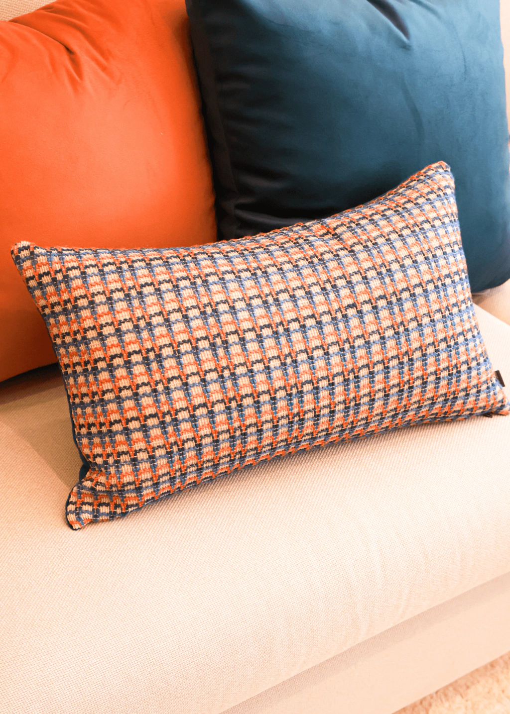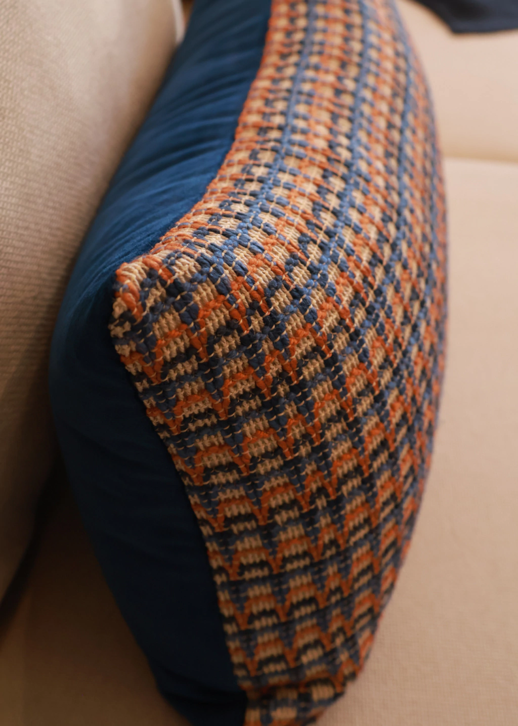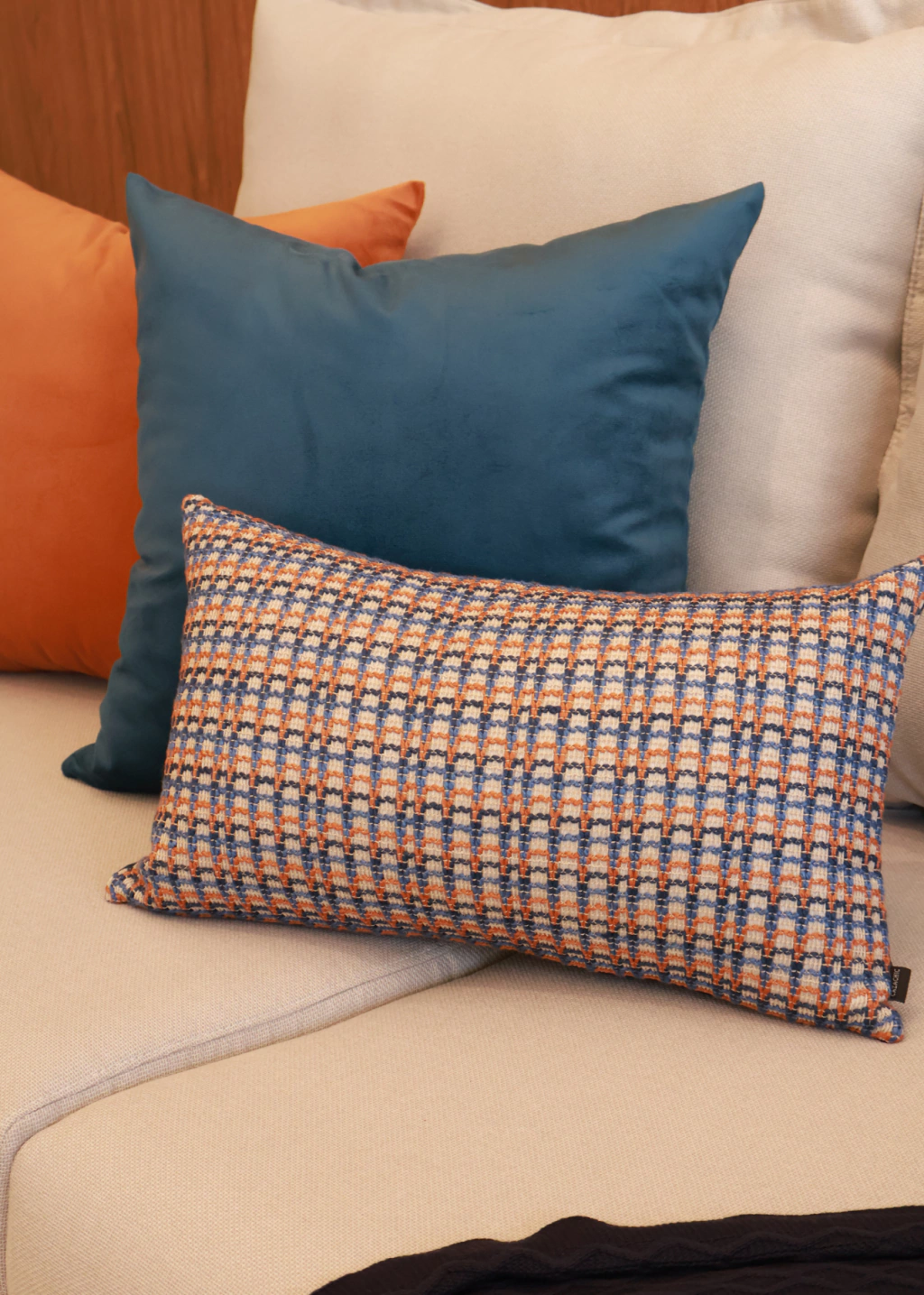 ALMOFADA BRISA BORDADO AZUL E LARANJA para deixar o ambiente estiloso e aconchegante. Desenvolvida com Design Exclusivo Cazachic. Essa almofada tem tamanho Retangular com 28x48, feita com linho bordado e verso em veludo.