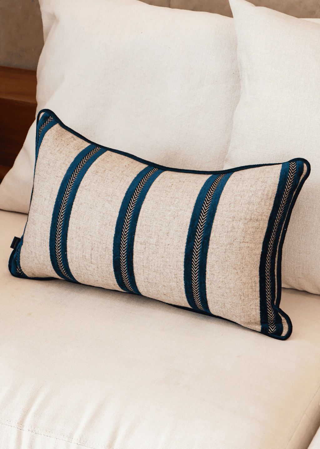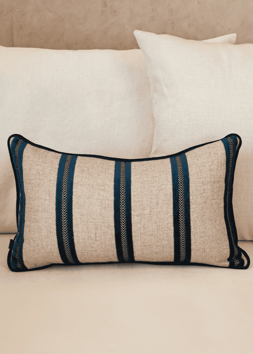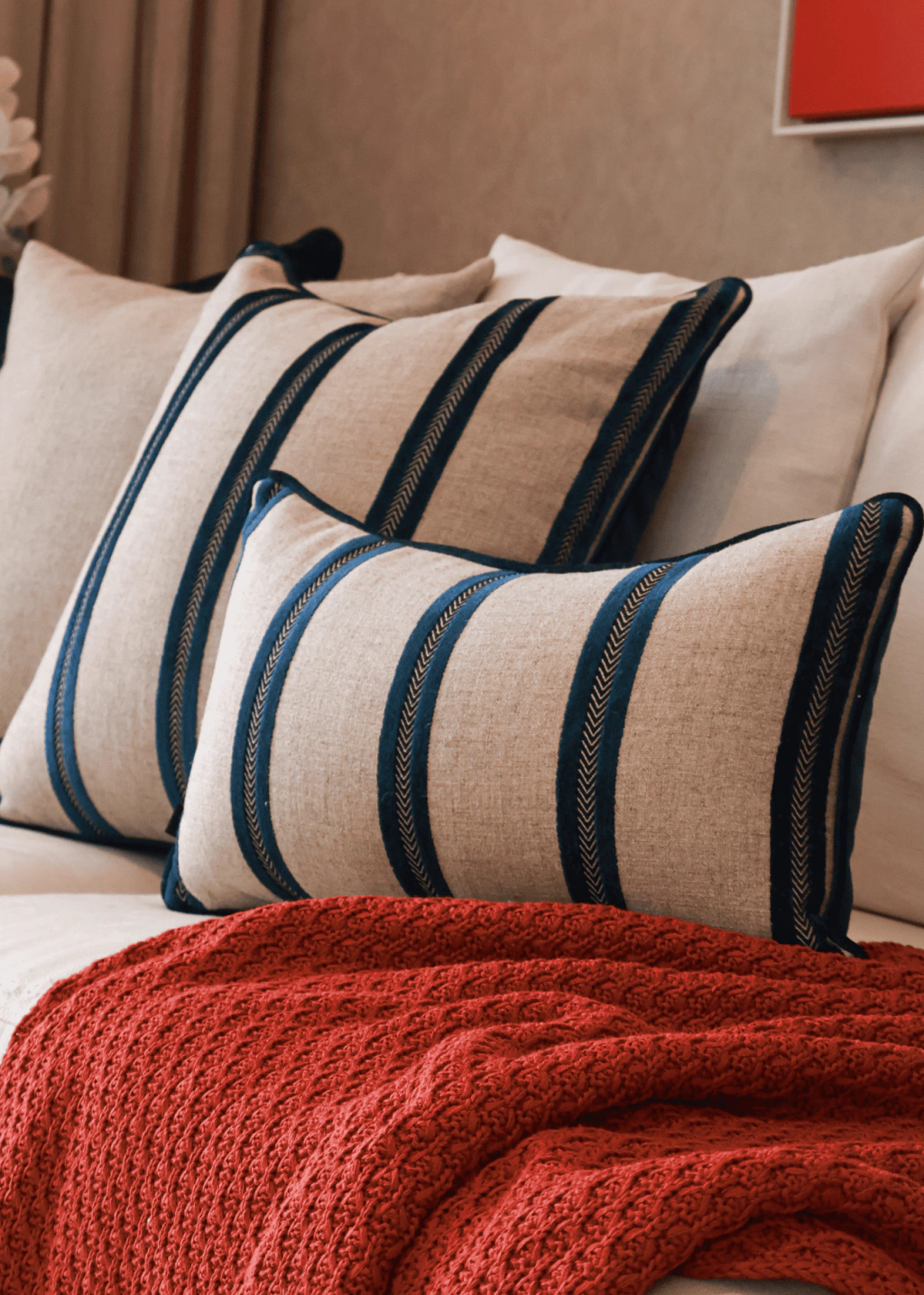 ALMOFADA GRÉCIA AZUL MARINHO Grécia traz a sensação acolhedora de uma casa de campo, com seu tecido encorpado e estampa listrada em tons naturais e azul marinho. Uma peça que combina rusticidade com sofisticação, ideal para criar um refúgio de tranquilidade no seu quarto — perfeita para composições que pedem um toque de personalidade e bom gosto.