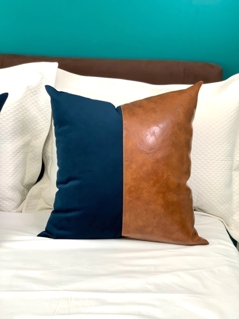ALMOFADA EM VELUDO DE ALTO PADRÃO E COURO ECOLÓGICO para deixar o ambiente estiloso e aconchegante. Desenvolvida com Design Exclusivo Cazachic. Essa almofada tem tamanho quadrado com 48x48, feita com tecido veludo azul marinho e couro ecológico caramelo.