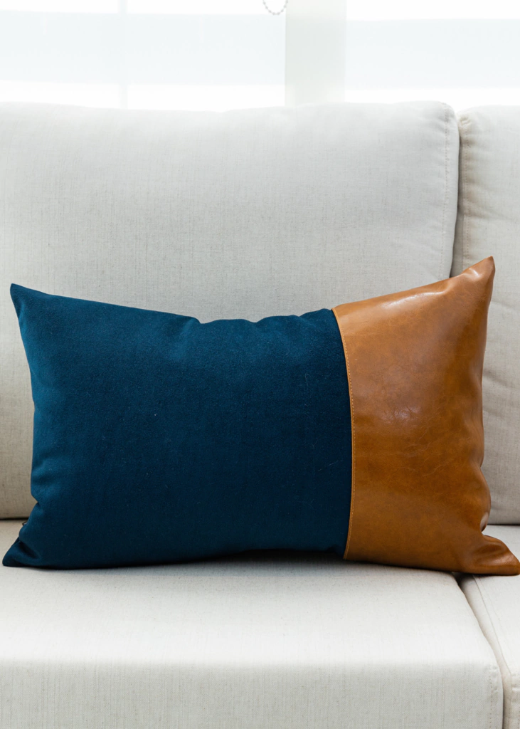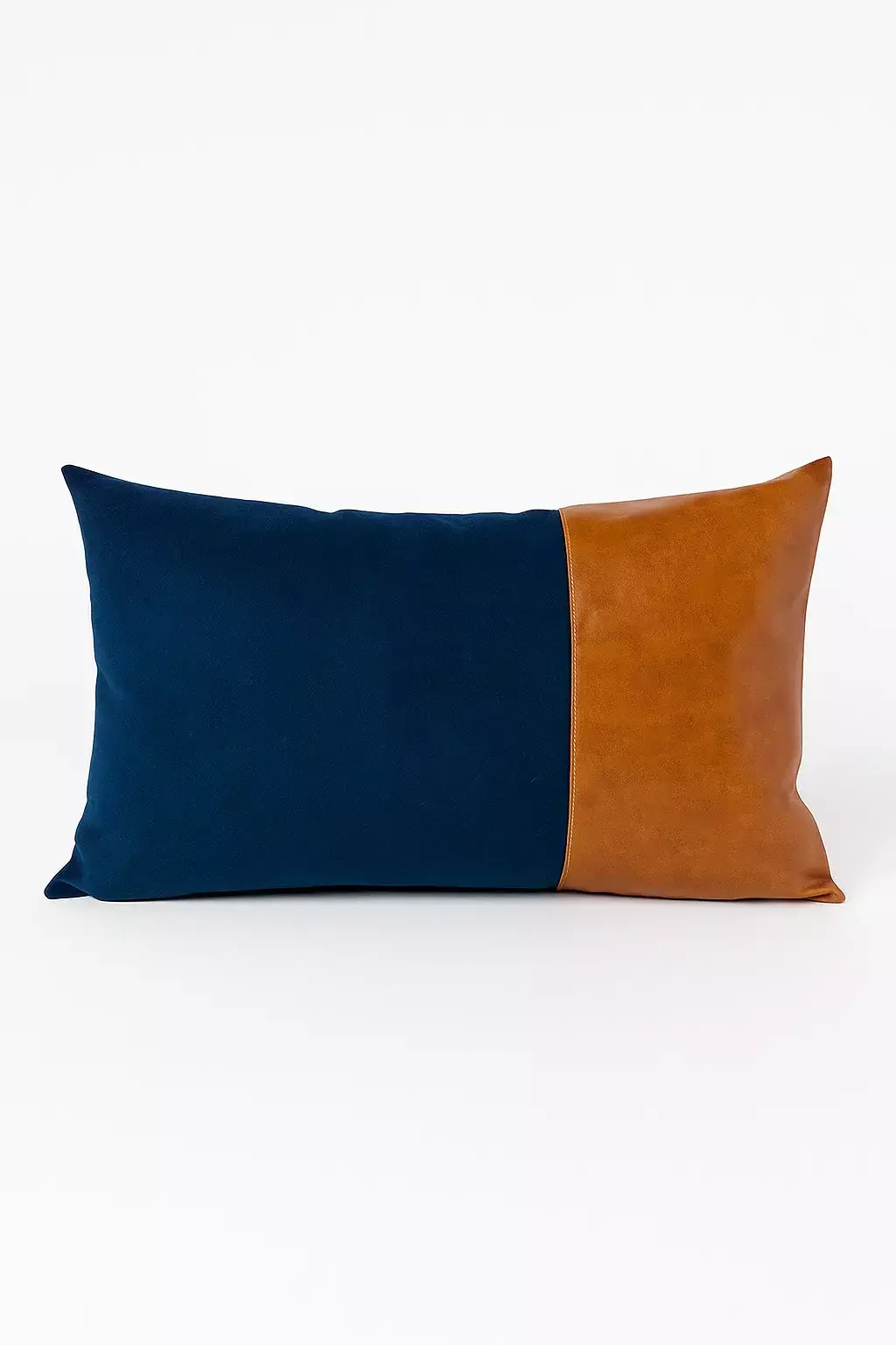 ALMOFADA RETANGULAR EM VELUDO E COURO ECOLÓGICO moderna e super versatil, esta peça é linda para dar um toque todo especial na sua poltrona ou sofá. Luxo e Sofisticação com estilo. Essa almofada maravilhosa tem shape retangular e é feita com veludo azul e couro ecólogico caramelo.