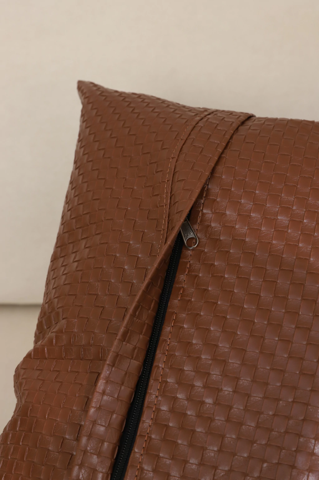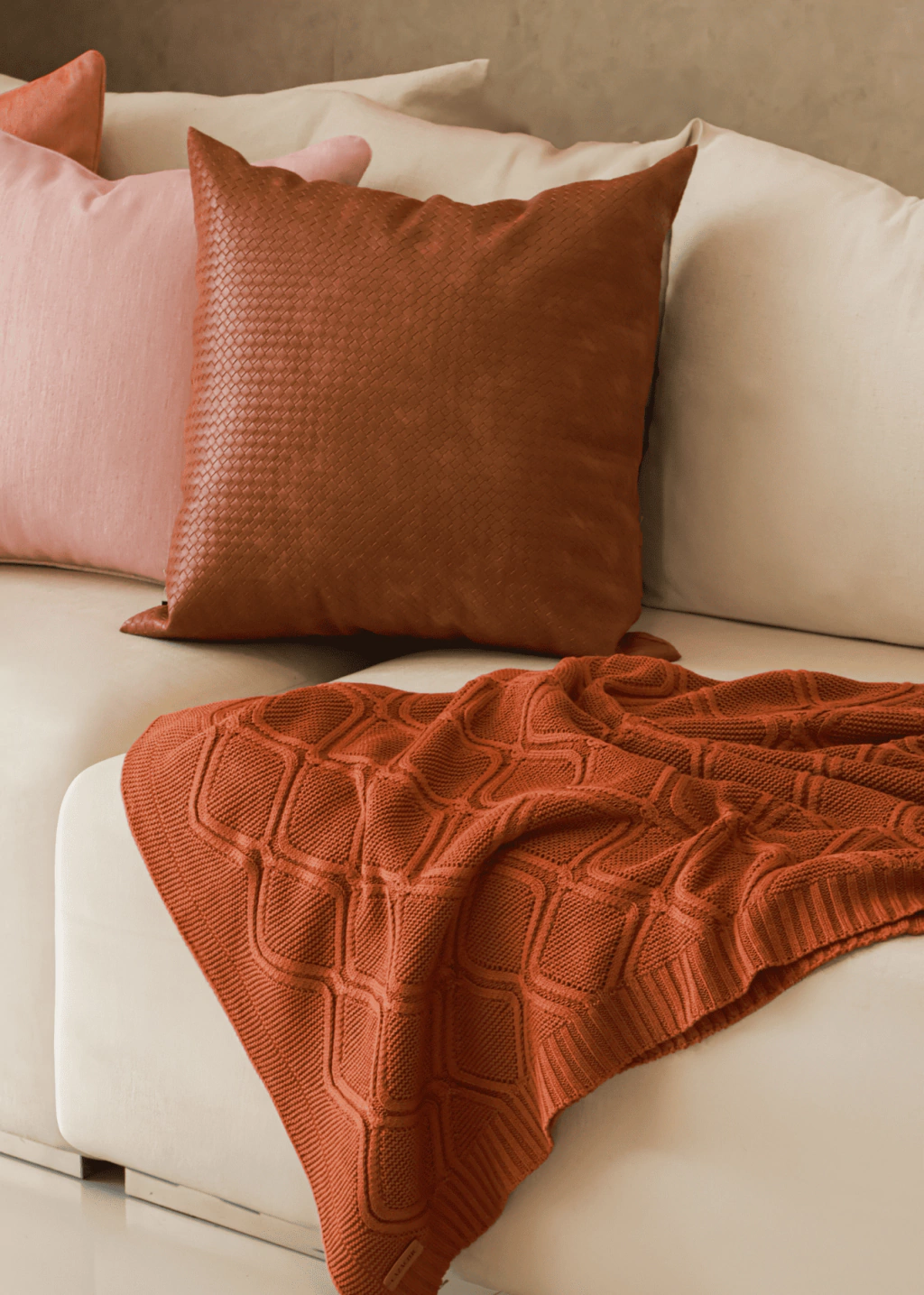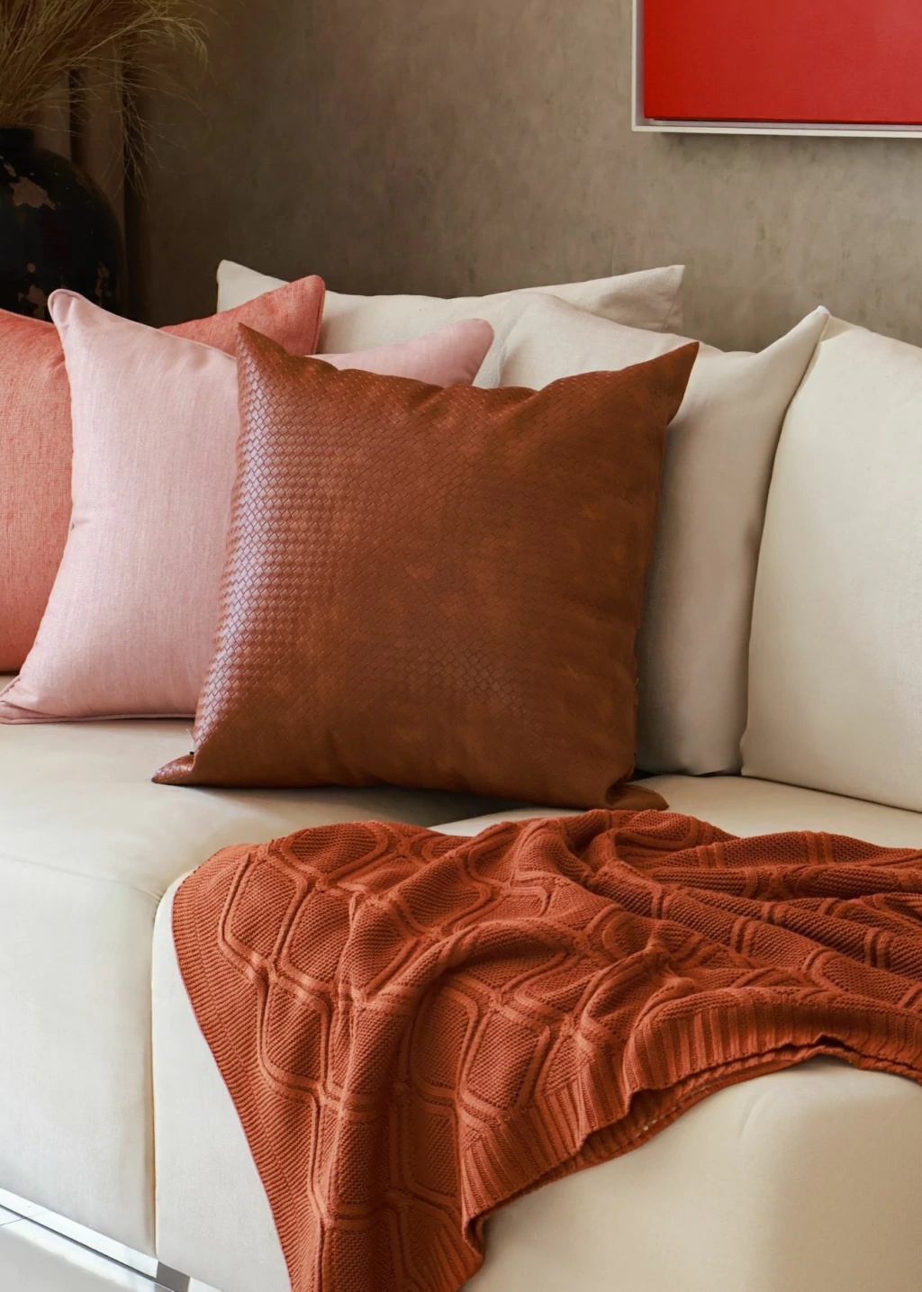 Vanilla combina tons rosé cremosos com tecidos caramelo, refletindo a tecidos quentes caramelo da estação. O Kit de 3 Almofadas Vanilla Cazachic une o couro ecológico tramado ao tear manual, criando uma composição sofisticada e artesanal para levar charme e aconchego a sofás, poltronas ou camas.