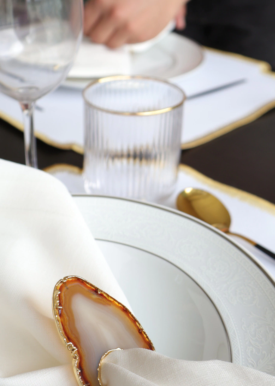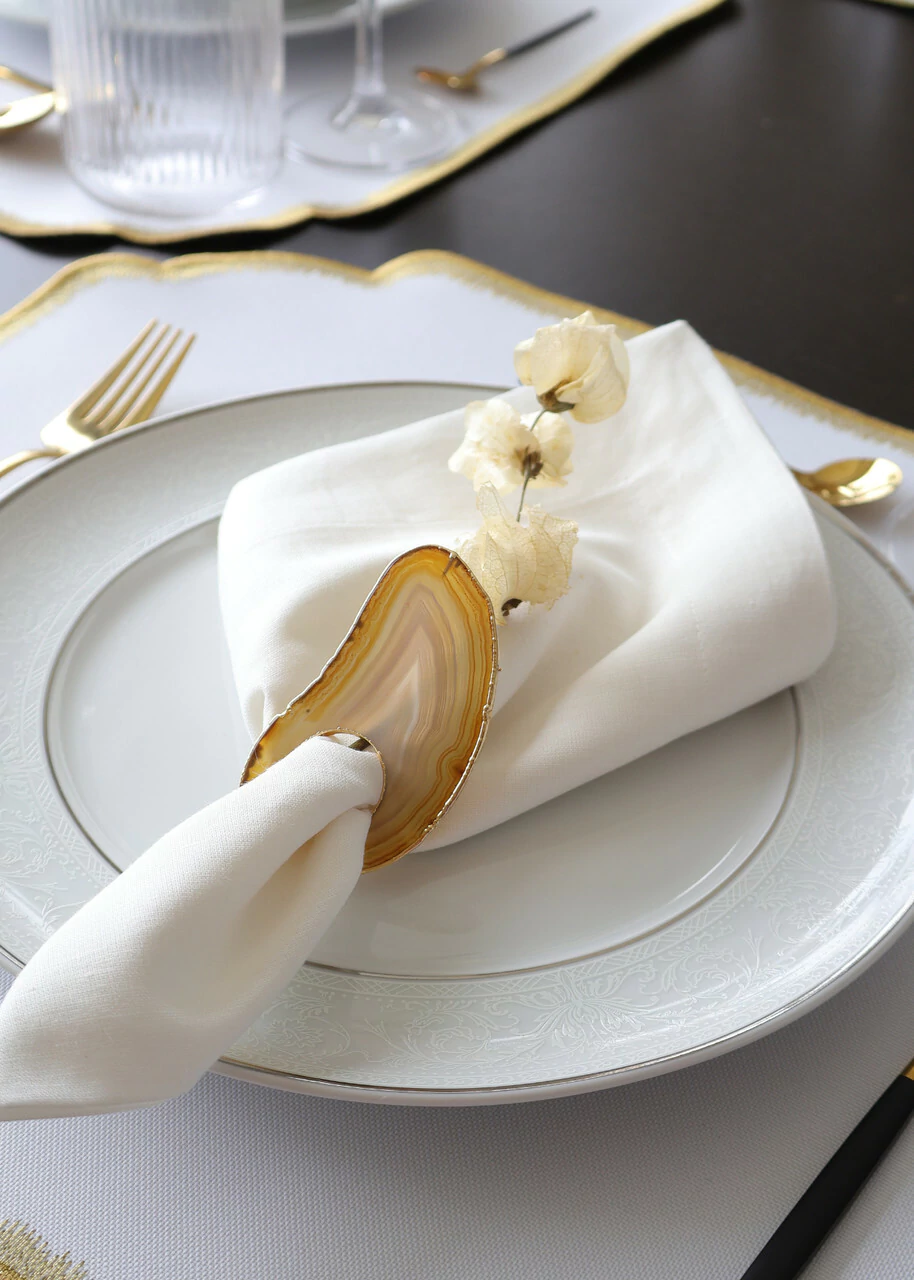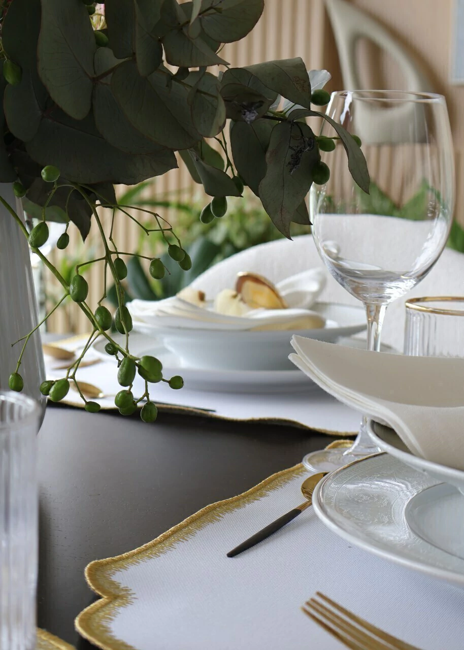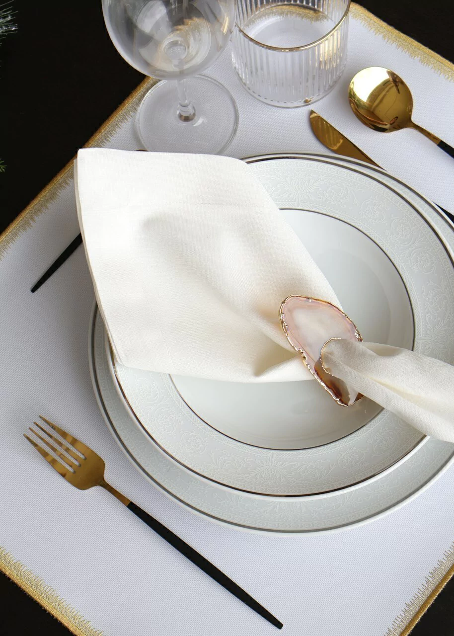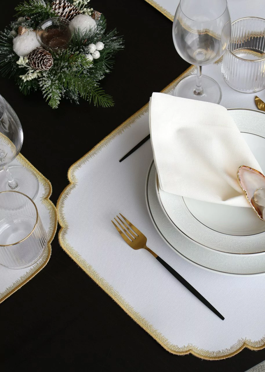 Lugar Americano Retangular em Lona Impermeável Duplo Cor Branco com Bordado Dourado